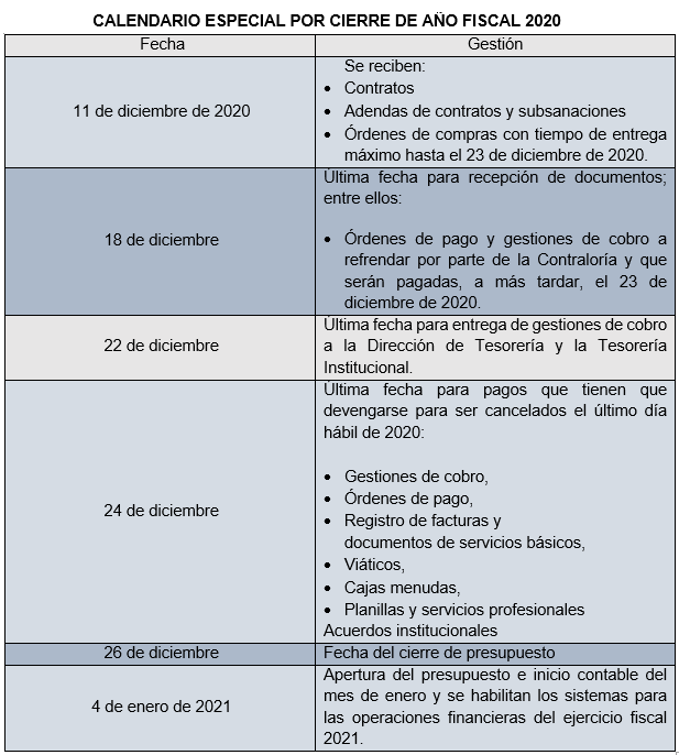 Ante el cierre del año fiscal 2020, la Contraloría General y el Ministerio de Economía y Finanzas coordinaron establecer un Calendario Especial para tramitar todos los procesos derivados de compromisos adquiridos por el Estado ante las emergencias sanitaria y ambiental y el pago de vigencias expiradas de 2019 y parte de 2020.